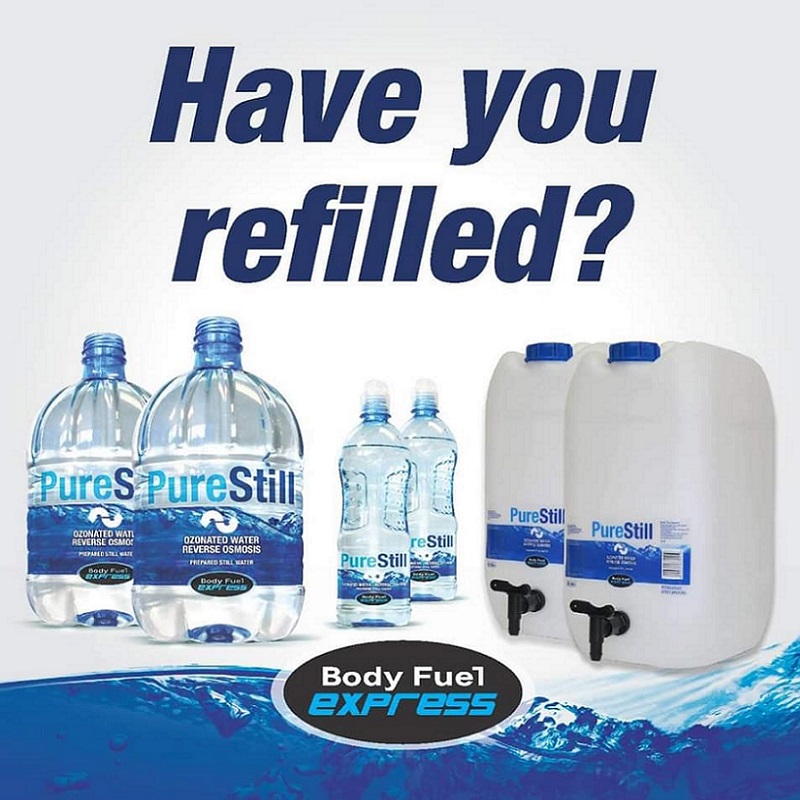 10 and 25 litre quick serve water containers for sale at Body Fuel Express Vredenburg.